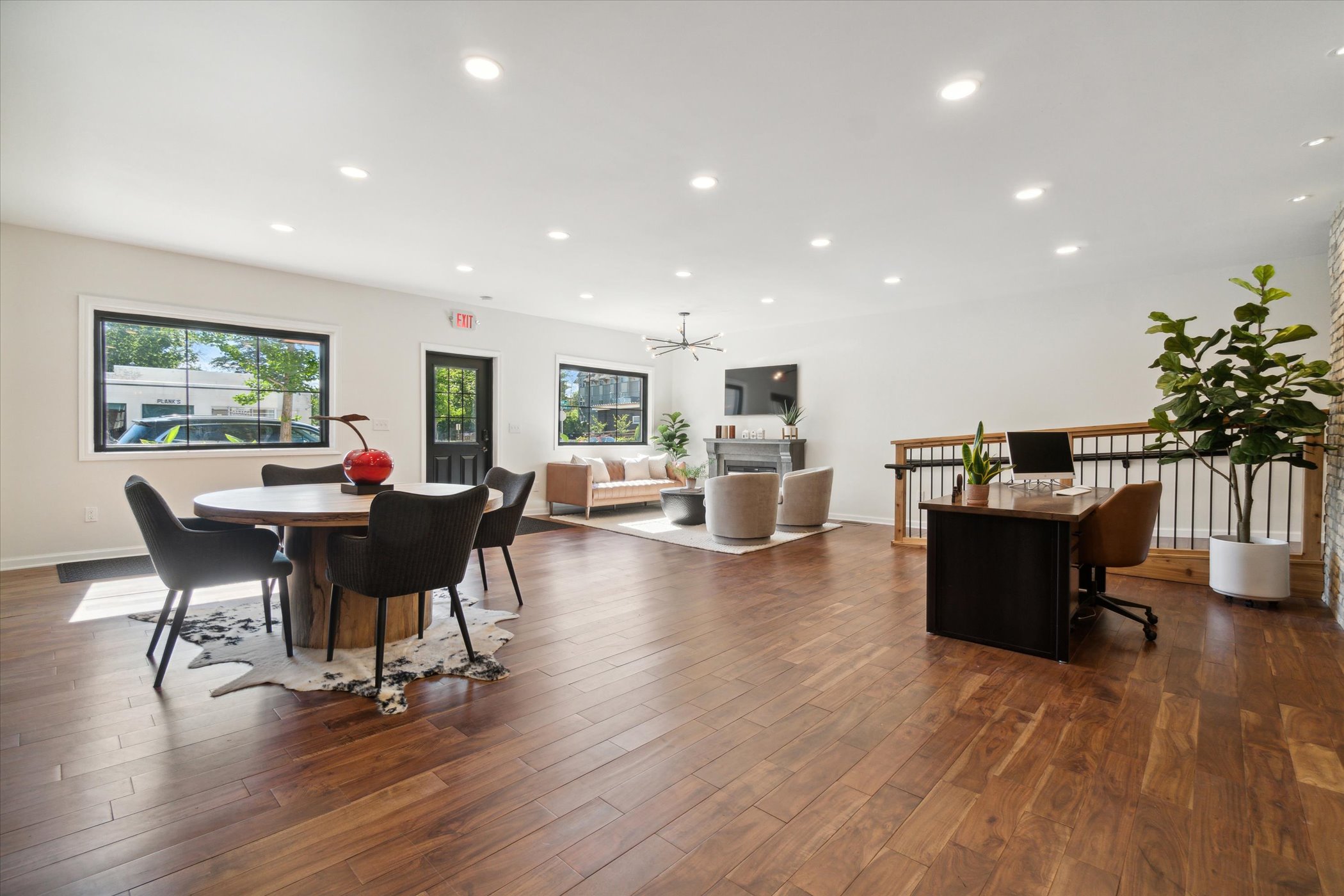We wanted to re-imagine a space where collaboration takes place and inspiration is born. With an open-concept employee lounge/closing lounge with TVs, a cappuccino machine, fireplace, music, and a functional garage door, agents can be open and available to each other and the community to discuss their true passions – real estate!
